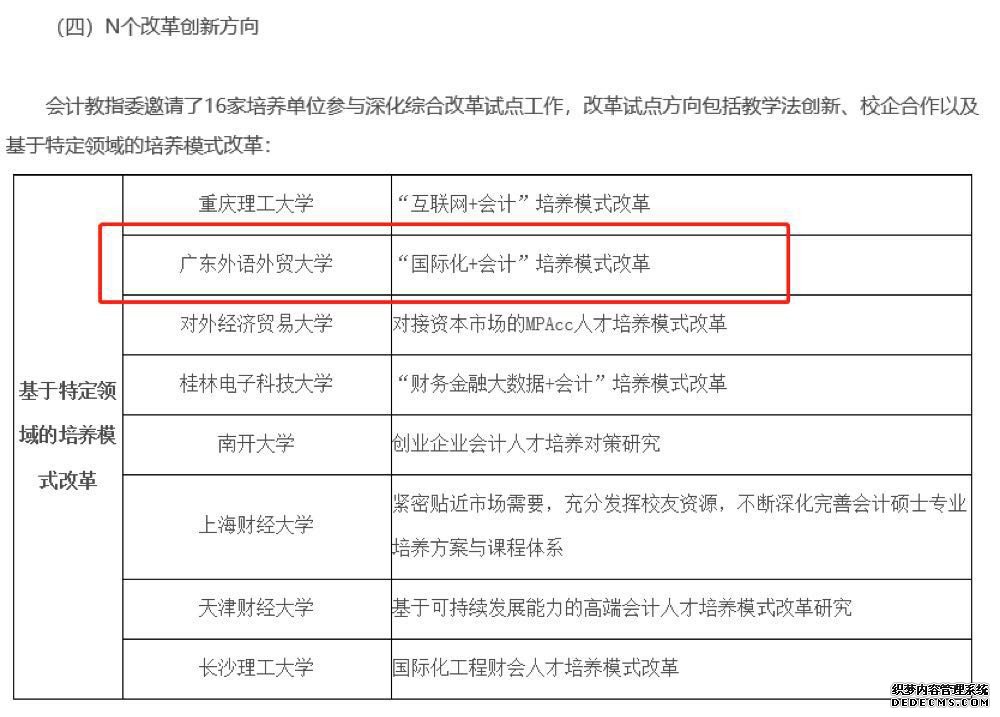 3月19日,教育部官网发布的深化开展专业学位研究生教育综合改革经验中,介绍了全国会计专业学位研究生教育指导委员会采用“123+N”的MPAcc深化综合改革试点方案,我校作为全国第一批MPAcc深化改革单位,承担了“国际化+会计”MPAcc培养模式改革。